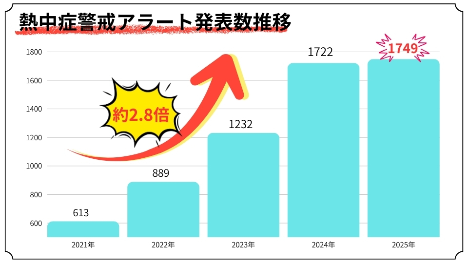 熱中症警戒アラートの発令回数は年々増加しており、2025年には春から秋にかけて全国で延べ1,700回以上発出されました。