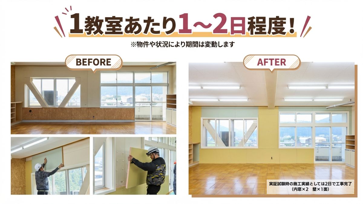 室内側に断熱材を施すことで工期を抑え、学校運営への影響を最小限にしながら、室温の安定化や冷暖房効率の向上が期待できます。
