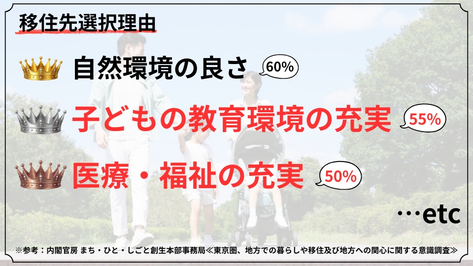 近年の調査では、移住先選択の理由として「自然環境の良さ(60%)」に続き、「子どもの教育環境の充実(55%)」「医療・福祉の充実(50%)」が上位に挙げられており、教育環境への関心の高さがうかがえます。
